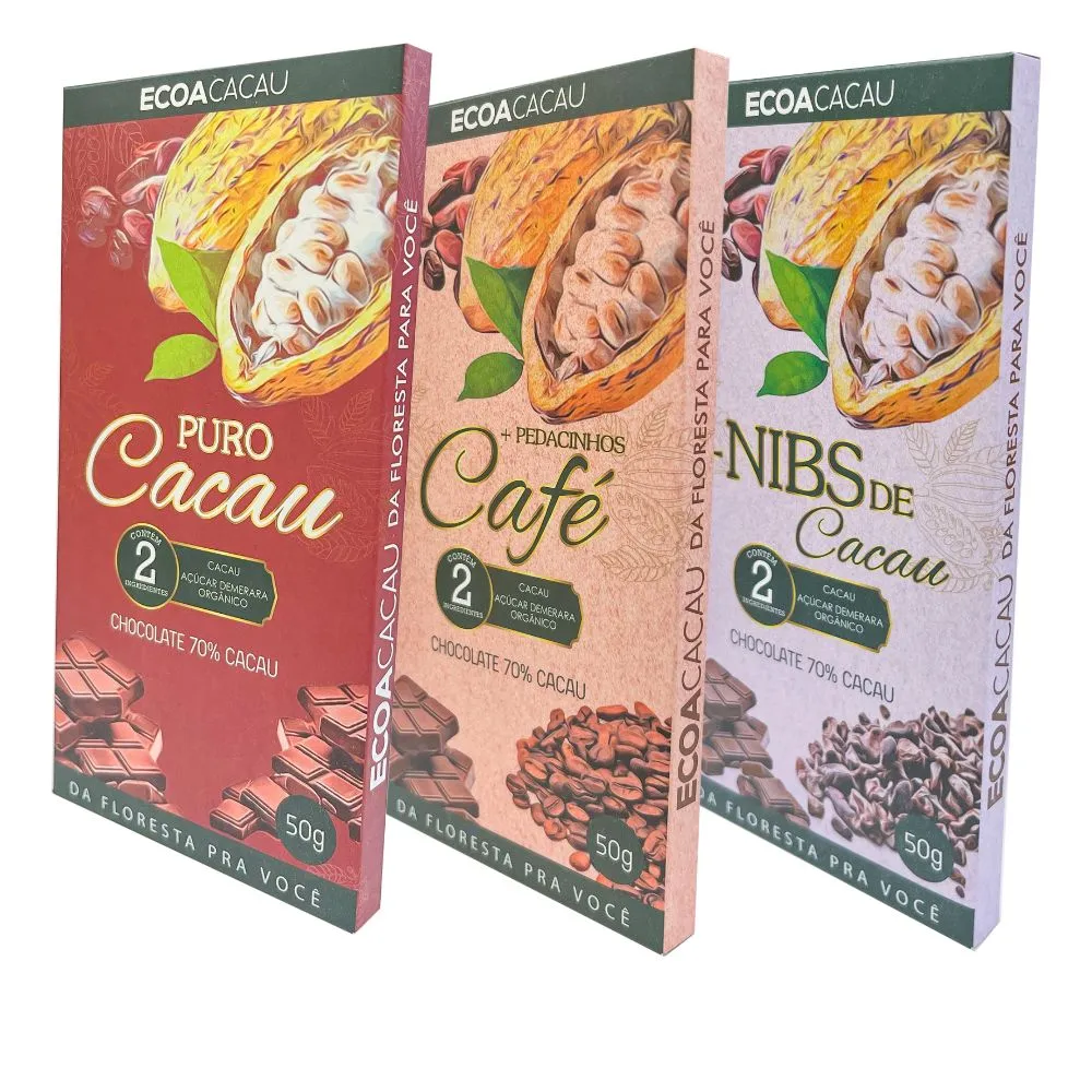 Embalagem: 3 tabletes de 50 gramas, totalizando 150 gramas de chocolate.